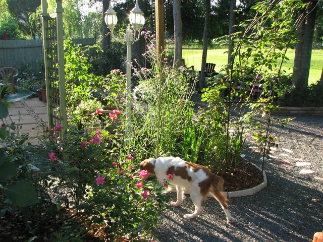 Later in May 'Red Cascade' was showing off, and Ellie is camera shy.